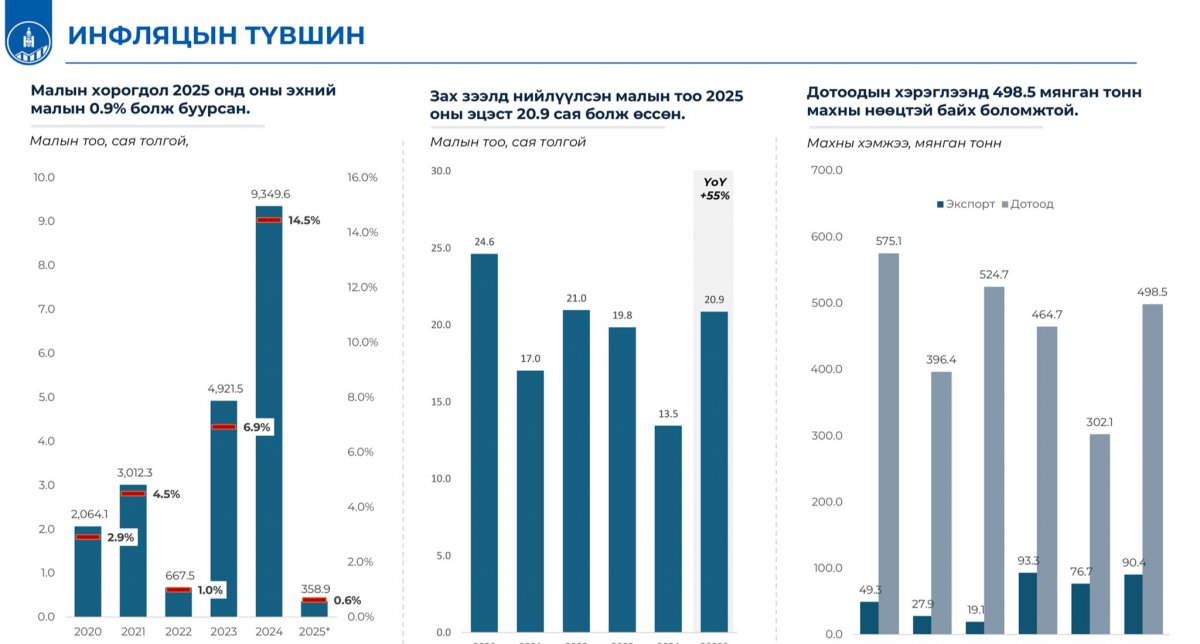 2024 онд 13.5 сая толгой малыг мах болгож төхөөрч нийлүүлсэн бол 2025 оны тухайд энэ тоо 55 хувиар өсөж 20.9 сая толгой малыг төхөөрчээ. Тэгэхээр мах бэлтгэлийн нөөц өмнөх жилээс харьцангуй өсөлттэй байхад хомсдол үүсэх боломжгүй юм.