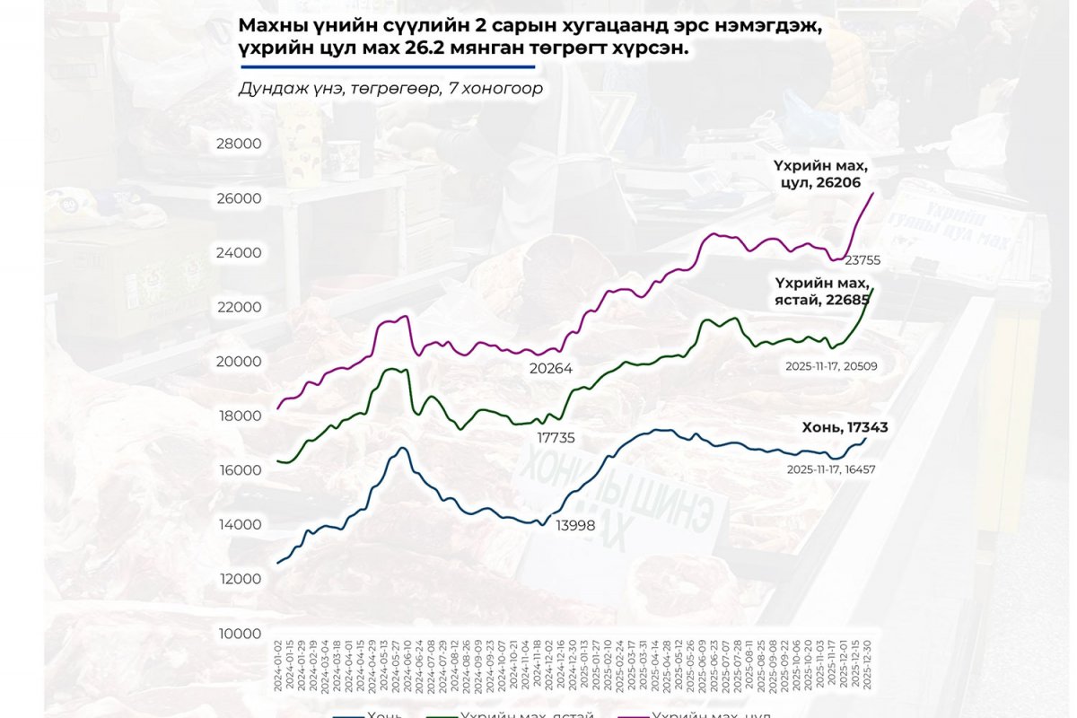 Тэгвэл өнөөдрийн тухайд одоо байгаа үнэ дээр нэмээд хоёрдугаар сард үхрийн мах 0.9 хувь, хонины мах 0.2 хувиар өсөхөөр байна. Өсөлтийн сарууд болох зургаадугаар сарын сүүл гэхэд сар бүрийн өсөлт явсаар 20 хувьд хүрэх магадлалтай байгаа юм. Тиймээс Засгийн газраас махны үнийн өсөлтийн хурдыг сааруулах зорилгоор Нийслэлийн хэмжээнд нөөцийн махны худалдааг 2026 оны нэгдүгээр сарын 20 буюу өчигдрөөс 450-500 цэгт нөөцийн махны худалдааг эхлүүлсэн. Нэг кг үхрийн мах 15 мянга, хонины мах 13 мянган төгрөгөөр борлуулна. Нийслэлээс энэ жил 6000 гаруй тонн нөөцийн мах бэлтгэсэн аж. Ингэснээр махны үнийн өсөлтийг сааруулна хэмээн Засгийн газраас байгуулагдсан Хүнсний бараа бүтээгдэхүүн болон тэр дундаа махны үнийн огцом өсөлтийг сааруулах Ажлын хэсгээс үзэж байгаа аж.