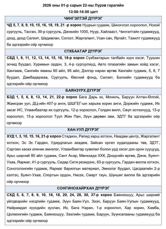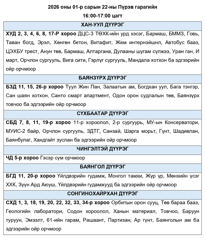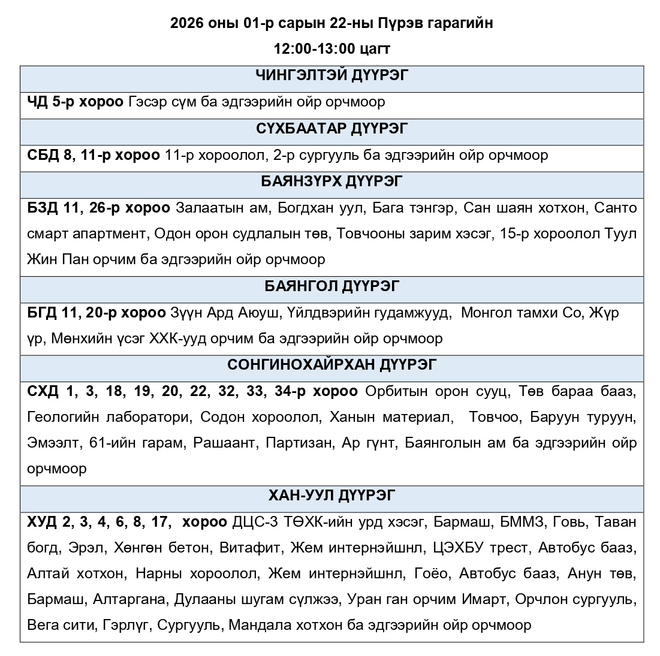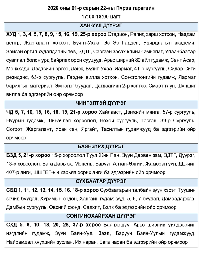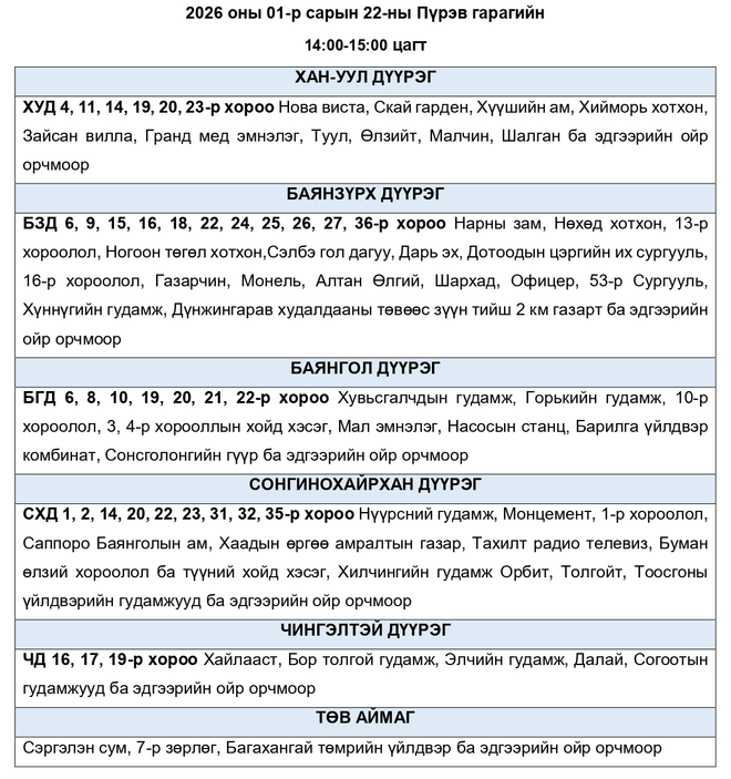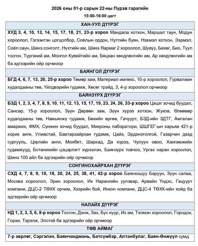 Өнөөдөр дараах байршилд цахилгаан хязгаарлаж болзошгүй