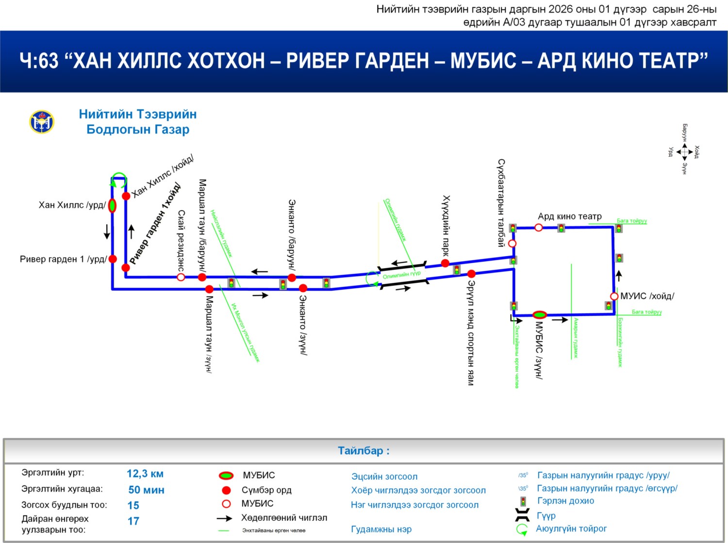 Нийтийн тээврийн үйлчилгээний хүртээмжийг нэмэгдүүлэх, автобусны зогсоол хоорондын зайг ойртуулж, иргэдийн эрэлт хэрэгцээг хангах үүднээс Хан-Уул дүүргийн 17 дугаар хорооны нутаг дэвсгэрт байршилтай Ривер гарден (хойд) зогсоолыг шинээр нэмлээ.