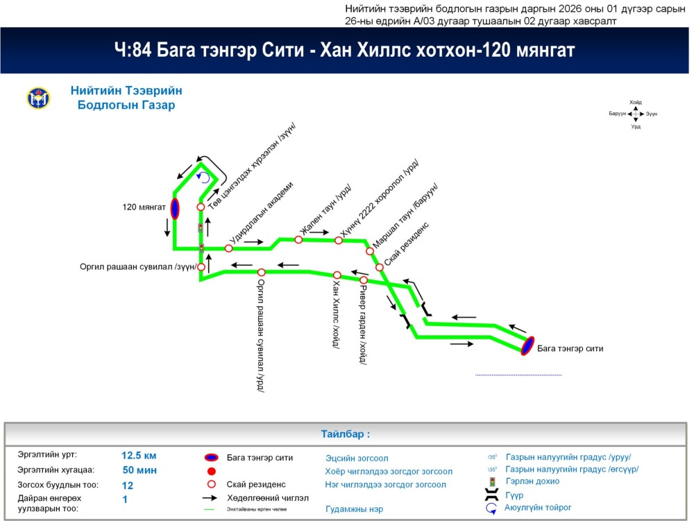 - Ч:84 "Бага тэнгэр сити-Хан хиллс хотхон-120 мянгат" чиглэлийн нийтийн тээврийн автобус зогсох юм.
