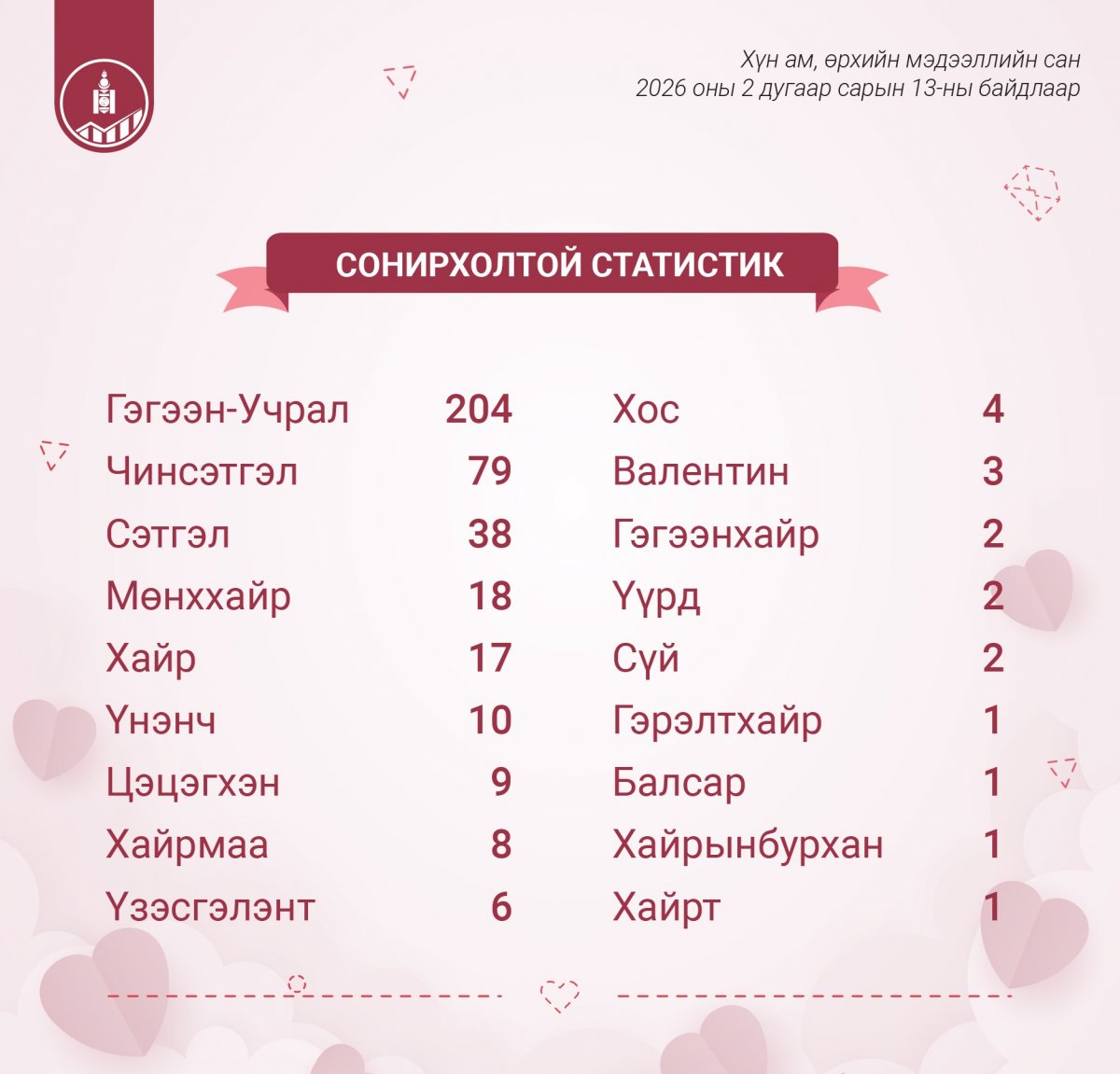 Хүн ам, өрхийн мэдээллийн санд 2026 оны хоёрдугаар сарын 13-ны байдлаар Валентин нэртэй 3 хүн, Гэгээнхайр нэртэй 2 хүн, Гэрэлтхайр нэртэй 1 хүн, Хайрынбурхан нэртэй 1 хүн, Балсар нэртэй 1 хүн байна.