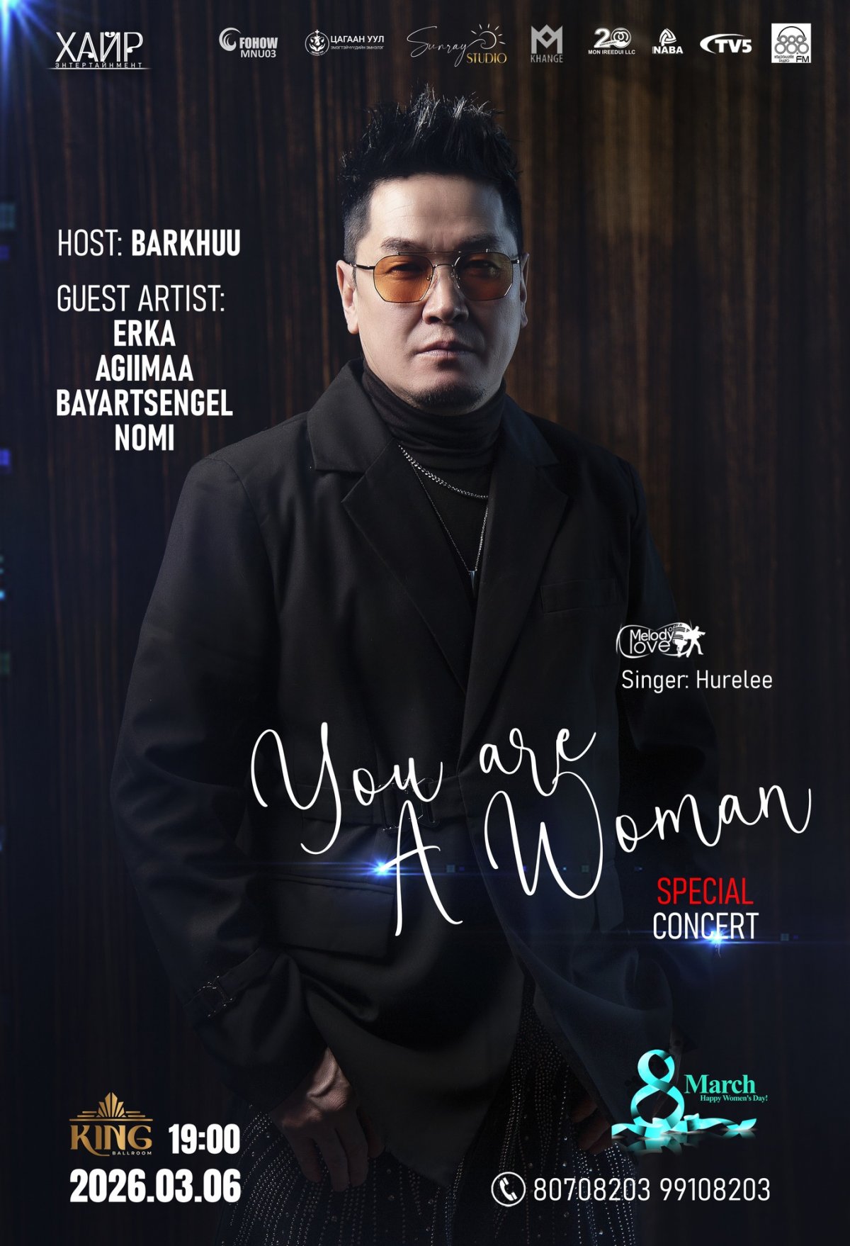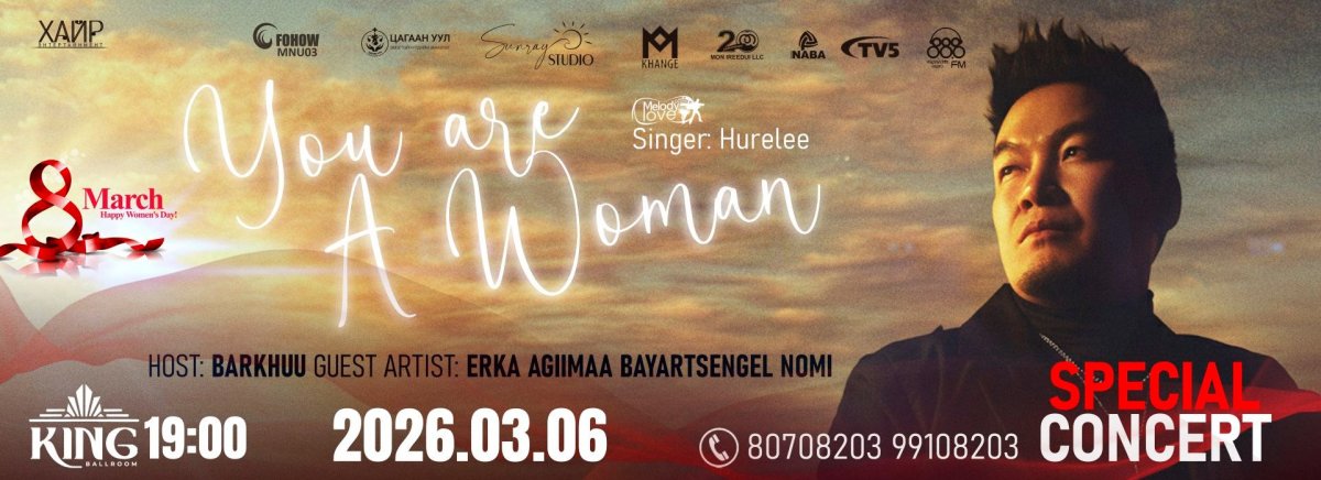 Олон улсын эмэгтэйчүүдийн баярт зориулсан Дуучин Хүрэлээгийн тусгай тоглолт ирэх сарын 06-нд Төв стадионы хойно King Ballroom-нд 19:00 цагт болох юм аа.