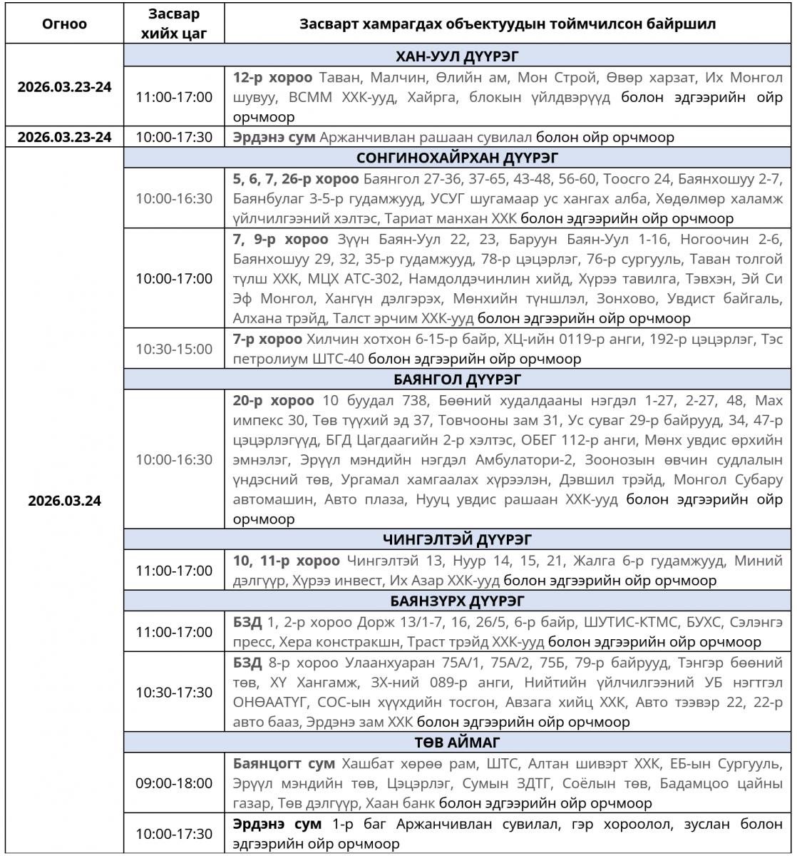 2026 оны гуравдугаар сарын 24-ний мягмар гарагт цахилгаан шугам сүлжээнд хийх засварын хуваарийг танилцуулж байна.