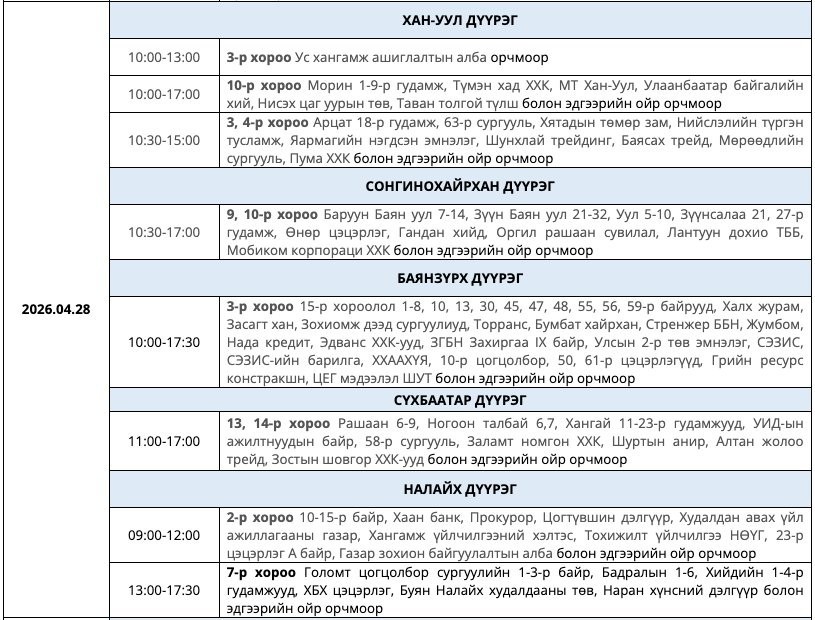 Маргааш буюу энэ сарын 28-ны Мягмар гарагт нийслэлийн Хан-Уул, Сонгинохайрхан, Баянзүрх, Сүхбаатар, Налайх дүүргүүдэд цахилгаан хязгаарлана.