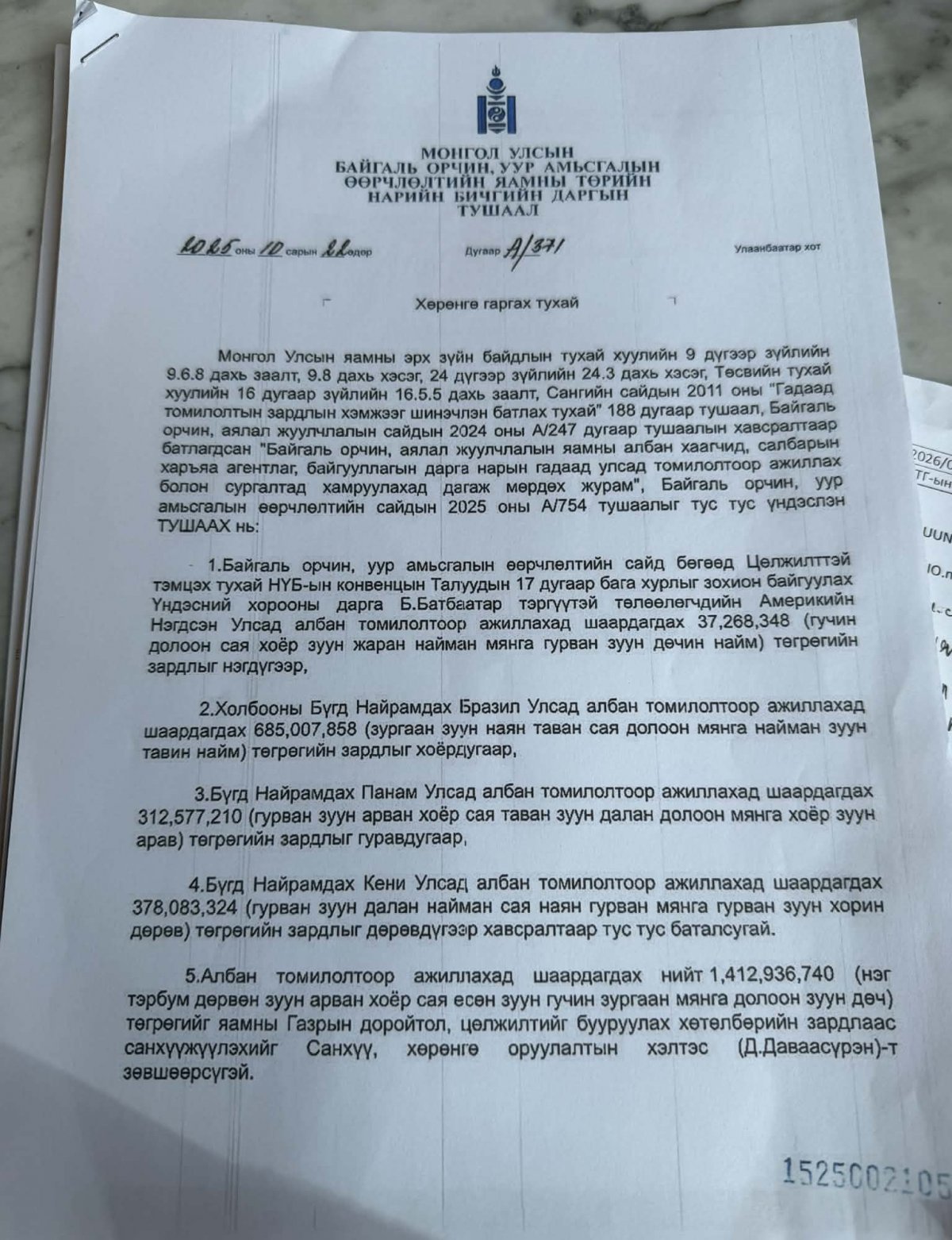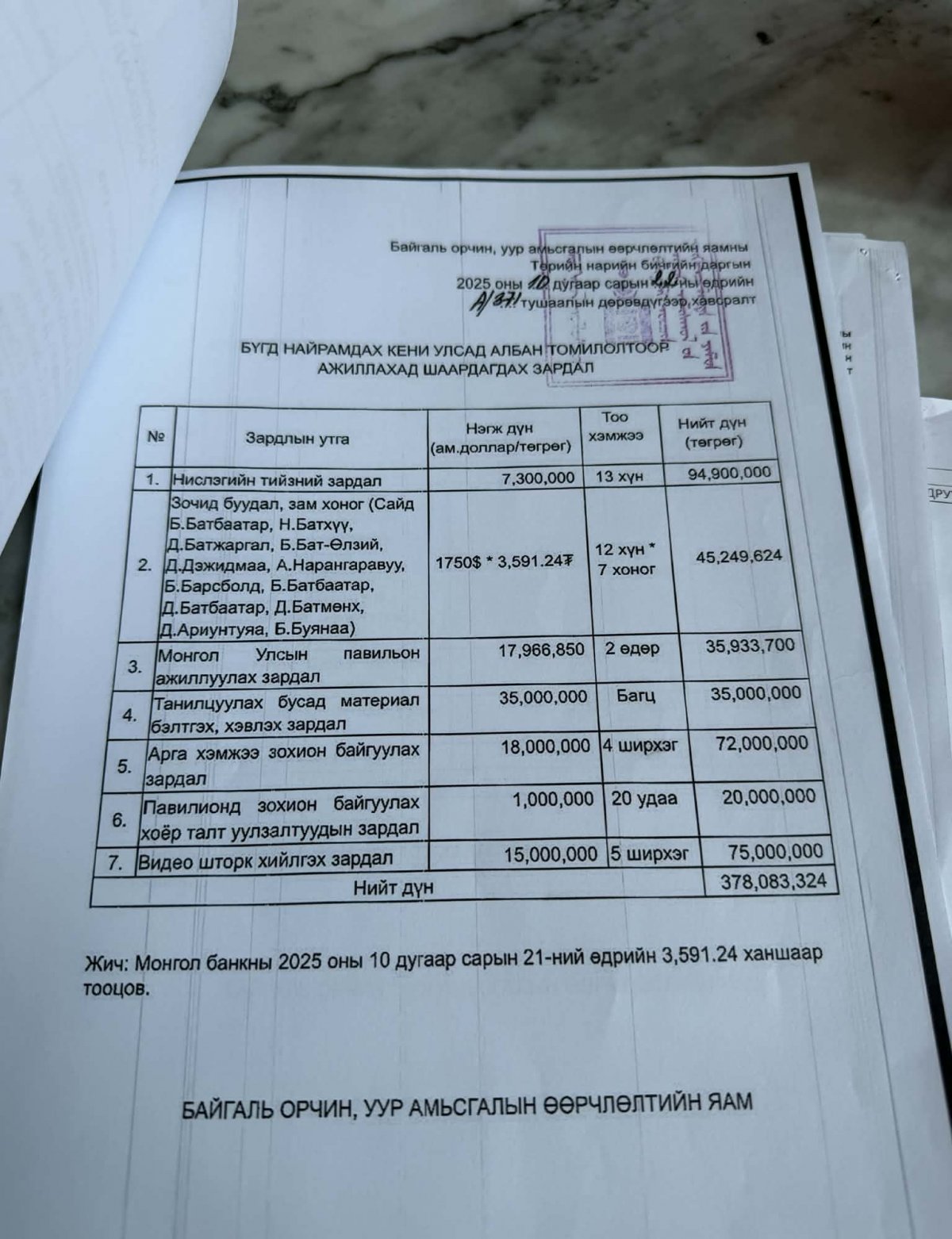 Кени улсад 15 сая төгрөгөөр дахиад тавыг хийлгэсэн, нэг сая төгрөгөөр 20 удаа павильон түрээсэлсэн, 35 сая төгрөгөөр танилцуулах материал хийлгэсэн. Панам улсад 10 сая төгрөгөөр 6 удаа, арга хэмжээ зохион байгуулахад 40 сая төгрөг, танилцуулах материал 30 сая төгрөгөөр хийлгэснийг Авлигатай тэмцэх газарт өгсөн.