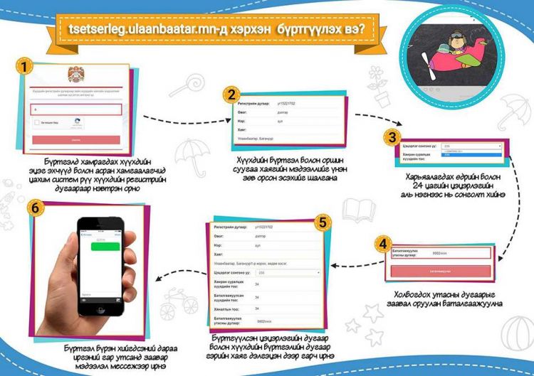 Иргэд хүүхдээ цэцэрлэгт шинээр хамруулах гэж байгаа бол http://tsetserleg.ulaanbaatar.mn/register хаягаар бүртгүүлэх боломжтой. Уг вэб рүү ороод хүүхдийнхээ регистерийн дугаарыг хийхэд аль дүүргийн хэддүгээр цэцэрлэгт хамрагдах боломжтой талаарх мэдээлэл гарч ирэх аж. Улмаар эцэг, эхийн гар утсанд бүртгэлийн тусгай дугаар ирэх ажээ.