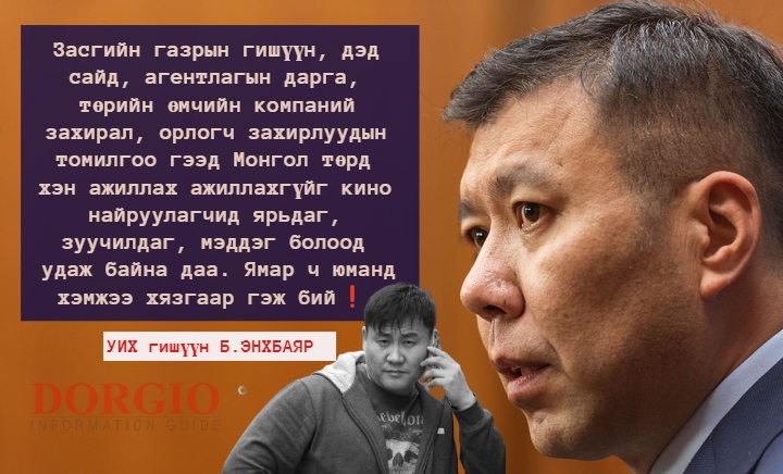 Олон нийтийн цахим сүлжээнд Ган-Очир гэх цахим хэрэглэгчээс “ЦЕГ анхаар !!! Бусдаас захиалга авч зохиомол хэрэг үүсгэж, бусдын компаний хувь хувьцааг дээрэмддэг, авч өгдөг цагдаагийн хурандаа нарын мафи байдаг болсон байна” гэ