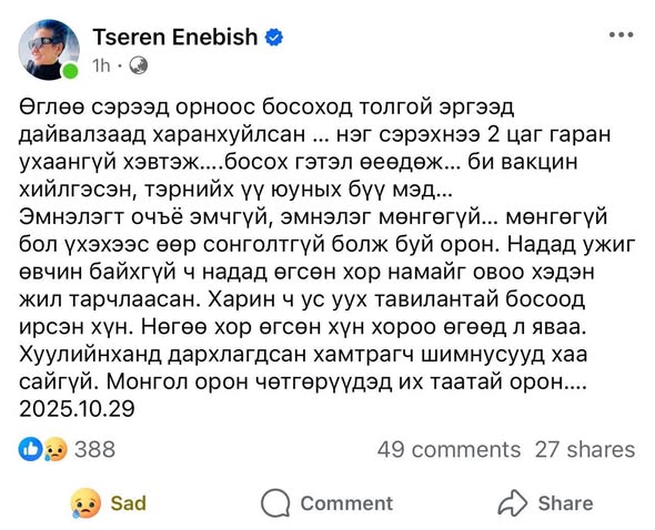 Иргэн Энэбишийн Цэрэнгийн амь насанд халдах зорилгоор хор өгүүлсэн захиалгын эзэн УИХ - ын гишүүнийг нэн яаралтайгаар баривчлан Ард Түмний нүдэн дээр гисгээж өгөхийг иргэд шаардаж байна!