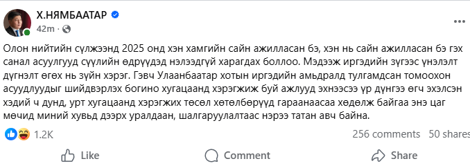 Тэрбээр "Олон нийтийн сүлжээнд "2025 онд хэн хамгийн сайн ажилласан бэ, хэн нь сайн ажилласан бэ" гэх санал асуулгууд сүүлийн өдрүүдэд нэлээдгүй харагдах боллоо. Мэдээж иргэдийн зүгээс үнэлэлт дүгнэлт өгөх нь зүйн хэрэг. Гэвч Улаанбаатар хотын иргэдийн амьдралд тулгамдсан томоохон асуудлуудыг шийдвэрлэх богино хугацаанд хэрэгжиж буй ажлууд эхнээсээ үр дүнгээ өгч эхэлсэн хэдий ч дунд, урт хугацаанд хэрэгжих төсөл хөтөлбөрүүд гараанаасаа хөдөлж байгаа энэ цаг мөчид миний хувьд дээрх уралдаан, шалгаруулалтаас нэрээ татан авч байна" гэлээ.